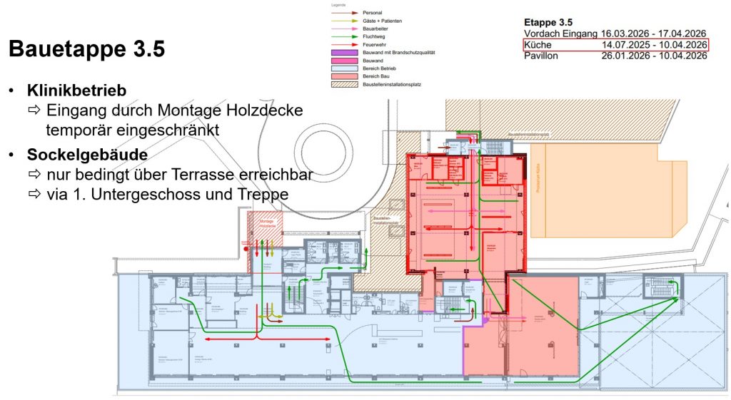 Aktueller Stand | Ausblick nächste Etappen13. Januar 2026Aktueller Stand im Projekt Big PictureIn den vergangenen Monaten wurde fleissig an verschiedenen Stellen am Bauprojekt gearbeitet. Für die Mitarbeitenden, Gäste und Besucher oftmals nur indirekt oder auf dem Weg durch die Klinikgebäude erfahrbar, standen in den Teiletappen der Phase 3 vor allem Innenausbauarbeiten im neuen Eingangsbereich und rund um den Betten- und die Personenlifte […] Schnittstellen zum Klinikbetrieb13. Januar 2026Bei einem Projekt wie Big Picture, welches sich zum einen über mehrere Jahre erstreckt, und das zum anderen in unterschiedlichen Bereichen des Areals Bautätigkeiten umfasst, entstehen zwangsläufig „Schnittstellen“ zum normalen (Klinik-)Betrieb. Diese umfassen sowohl kleine, „nebensächliche“ Themen, können aber auch umfangreiche und weitreichende Fragestellungen beinhalten. Die nachstehend gezeigte Arealkarte zeigt die für dieses Projekt relevanten […] Ausblick auf die nächsten Bauetappen11. August 2025Mit der 3. Etappe ist ein weiterer zentraler Bauabschnitt gestartet worden. Der nachstehende Planausschnitt zeig den in den kommenden Monaten aktiven Bauperimeter in Rot: Damit der Betrieb (in Blau) aber weitergehen kann – die Klinik kann nicht einfach über ein paar Monate geschlossen werden… – wurde in enger Zusammenarbeit vom Architekten zusammen mit der Bauleitung […] Ausblick lärmintensive Arbeiten11. August 2025Wo gehobelt wird… Bei uns wird aber grad nicht gehobelt, sondern gespitzt und anstelle der Späne entsteht Schutt und Staub, alles mit dem Ziel, dass in den nächsten Wochen etwas Schönes und „Gfröites“ den freigewordenen Platz einnehmen darf. Einhergehend mit dem Rückbau entsteht leider entsprechender Baulärm, insbesondere in Anbetracht des Unterlagsbodens, welcher zurückgebaut werden muss. […] Aktueller Stand Big Picture – EG West25. Juli 2025Ab Oktober des letzten Jahres wurde der Westflügel vom Bärghuus umgebaut, wo neu der Empfang und die Lounge, nebst anderen Räumlichkeiten vorgesehen sind. Um den benötigten Platz zu schaffen, wurde deshalb der gesamte Innenraum bis auf den Beton zurück gebaut. Die Webcam hat die letzten Wochen in einem kurzen Clip festgehalten: Mit dem Umzug des […] Bitte dieses Feld leer lassenBig Picture - neuer Post ! Gerne informieren wir Sie über neue Inhalte auf unserer Bau-Page Ihre Angaben werden ausschliesslich für die Benachrichtigung im Kontext "Big Picture" genutzt ! Bitte prüfen Sie Ihren Mail-Eingang oder den Spam-Ordner für die Bestätigungsmail, welche wir Ihnen zugestellt haben.