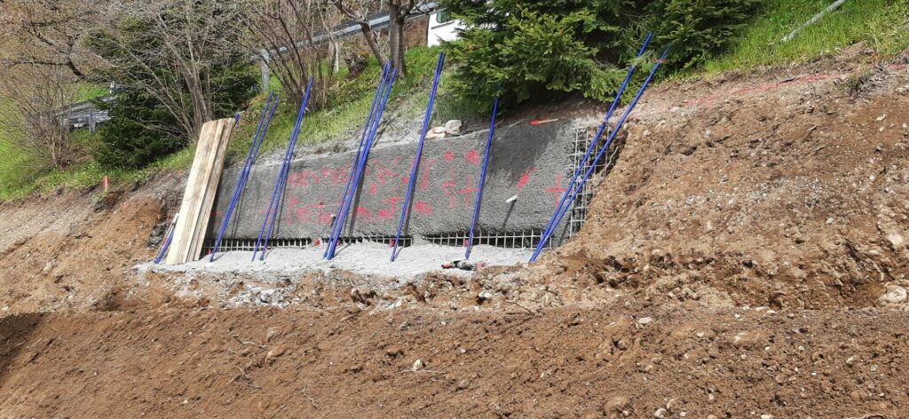 Durch die Nutzung des Hangs entsteht eine steile Wand, welche mit Hilfe von Stahlankern und weiteren Spezialwerkzeugen und -maschinen gesichert werden muss:
