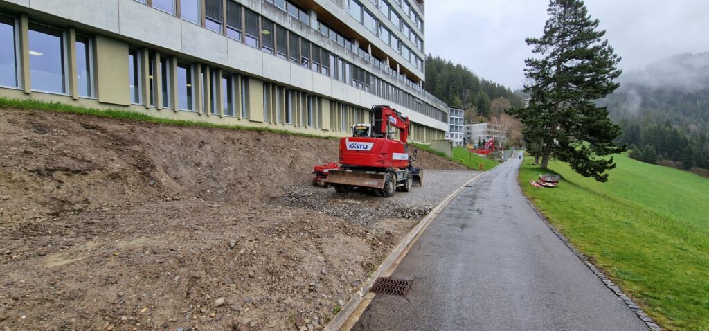 Um diesen Ansprüchen gerecht werden zu können und das ohnehin schon knappe Mitarbeiter- und Gästeparkplatz-Angebot nicht noch weiter zu schmälern, werden auf der Südseite entlang der „Baustrasse“ für die Dauer des Bauprojekts weitere 15 Parkplätze für die Bauarbeiter bereitgestellt. Dazu muss für rund drei Jahre der Hang abgetragen und „Zwischengelagert“ werden, bevor dann am Ende der Bauzeit die Umgebung wiederhergestellt werden kann. Ein aufwändiges und eher kostspieliges Unterfangen…