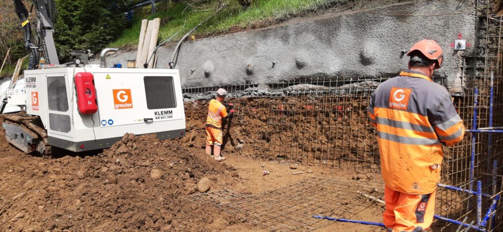 Ob vom Bagger zerrissene, nicht dokumentierte Stromkabel oder rutschender Hang in der Aushubstelle, den Bauleuten wird’s nicht langweilig ! Und um den Spass zu vervollständigen, regnet es grossmehrheitlich, so dass die Baustelle zeitweilig einem grossen „Sumpfloch“ gleicht. Allen Widrigkeiten zum Trotz rücken die Spezial-Tiefbauer Meter um Meter vor und tiefer; vorzu wird der freigelegte Hang in passenden Etappen mit Eisengittern stabilisiert und anschliessend mit Spritzbeton befestigt, bevor mit einem Spezialgerät die stabilisierenden Anker gesetzt werden.