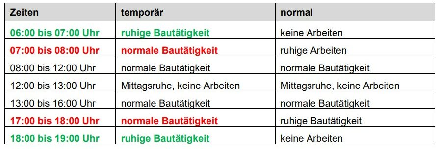 Um das Bauprogramm einhalten zu können, sind wir gezwungen, ab Montag, 19. Juni für voraussichtlich zwei Wochen die Bauzeiten zu verlängern. Für besagte Zeitspanne gelten neu die nachstehenden Lärmfenster: