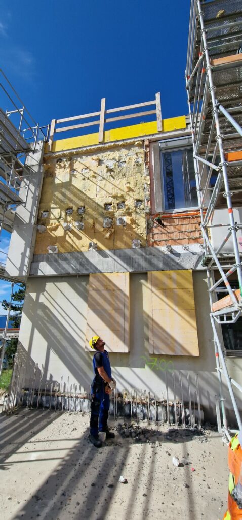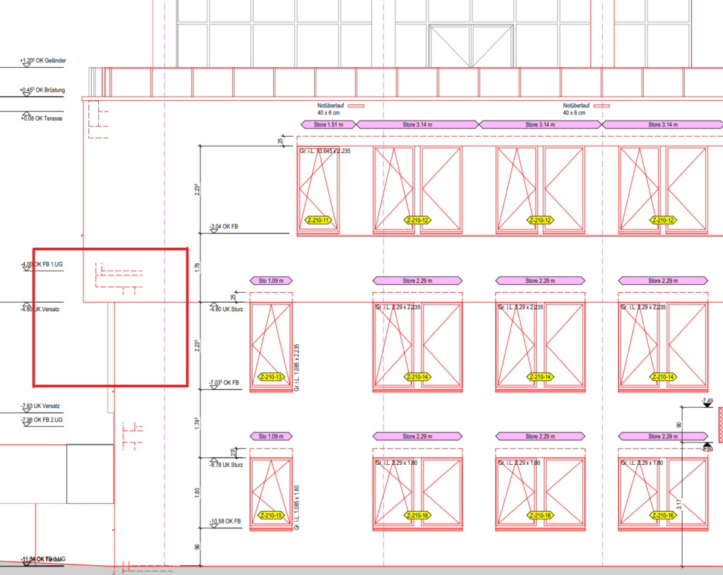 Wie bereits erwähnt, muss die untere Reihe der Fassadenelemente (mit den Bohrlöchern) mittels Kernbohrungen, ebenso wie der Boden des Erkers sowie die bezeichnete Fensterfront entfernt werden, bevor dann mit dem Anbau des Pavillondaches / neuen Erkerbodens begonnen werden kann. Für diese Arbeiten wird mit erhöhtem Baulärm gerechnet, da die Abbrucharbeiten am Bestand durchgeführt werden müssen (siehe dazu auch den Artikel bzgl. Fassadendemontage).