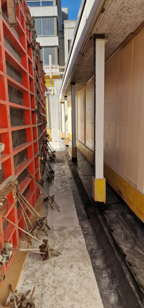 In den letzten Wochen ist der Neubau „Sockelgebäude“ rasant in die Höhe gewachsen. Die Nahtstellen zum Sockel des Bestandesbaus im 3. und 2. Untergeschosses wiederum waren aufgrund der einheitlichen Fassadenfront relativ einfach zu realisieren, die Lärmemissionen hielten sich dementsprechend in engen Grenzen.