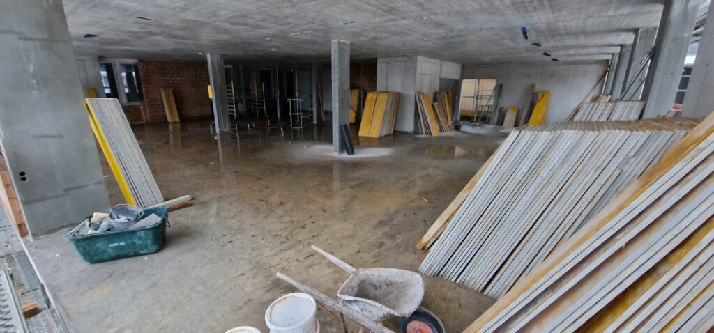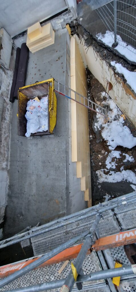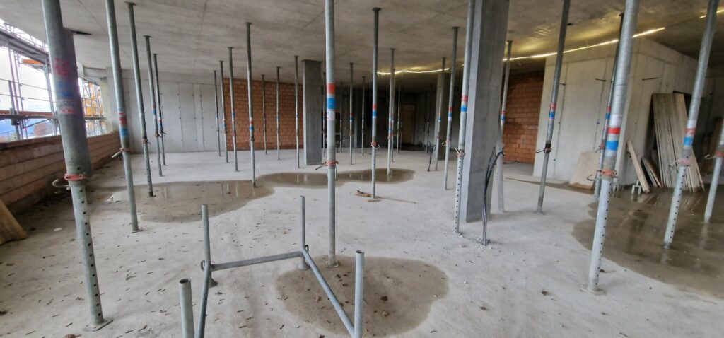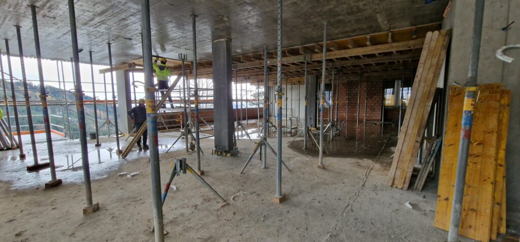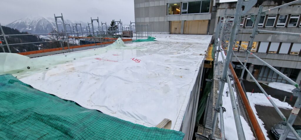 Das Bauprogramm sieht nun bis Ende Jahr vor allem noch Arbeiten an den Schnittstellen zum Bestand vor. Zudem hat es etliche Dach-Flächen, welche noch nicht (abschliessend) abgedichtet sind; des Weiteren können in den unteren Stockwerken die Schaltafeln und Stützen entfernt werden.