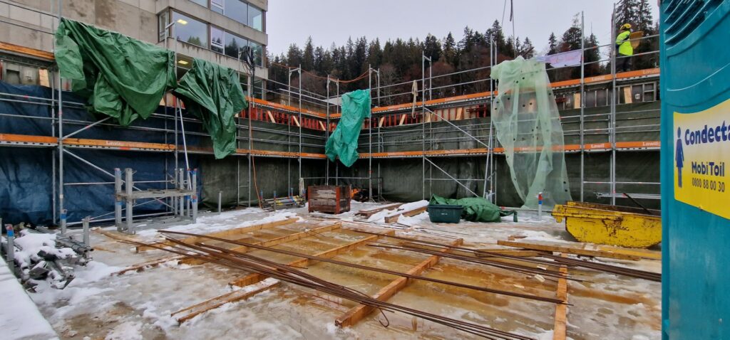 Bislang haben die Bautätigkeiten seit ihrem Start im April von ausserordentlich gutem Wetter profitiert. Mit dem zwar nicht überraschenden, aber doch recht abrupten Wintereinbruch hat sich das zumindest für das Betonieren des Pavillondachs geändert; dieser Schritt fand am 11.12.2023 bei dichtem Schneefall und seeehr bescheidenen Temperaturen statt, was etliche Zusatzmassnahmen erforderte, um die vorbereiten Schalungen auf den fürs Betonieren benötigten Temperaturen zu halten: