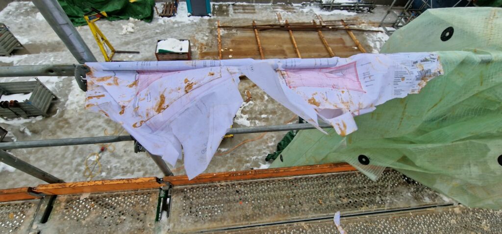 Auf Papier ausgedrucktes Planwerk ist für die Arbeit auf dem Bau in strömendem Regen bzw. dichtem Schneefall nur bedingt geeignet… 🙂
