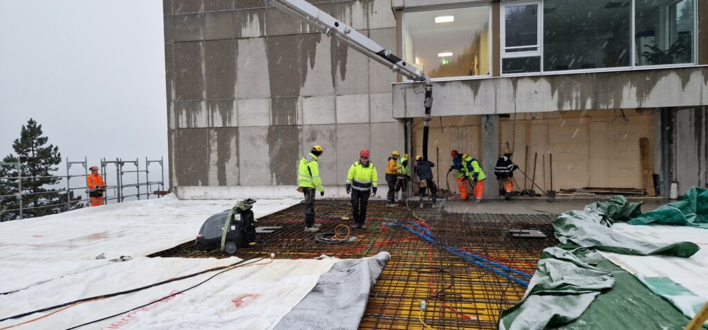 So wurde der eigentliche Pavillon-Bereich mit Blachen verschlossen, der Innenraum mit Heissluft temperiert, während auf dem eigentlichen Pavillondach Heizdecken die Temperaturen in einem für den Beton bekömmlichen Bereich halten mussten. Das Betonieren wiederum ging erstaunlich schnell, mit einem „Grossaufgebot“ an Mensch und Material vonstatten und war in rund einem halben Tag über die Bühne gebracht: