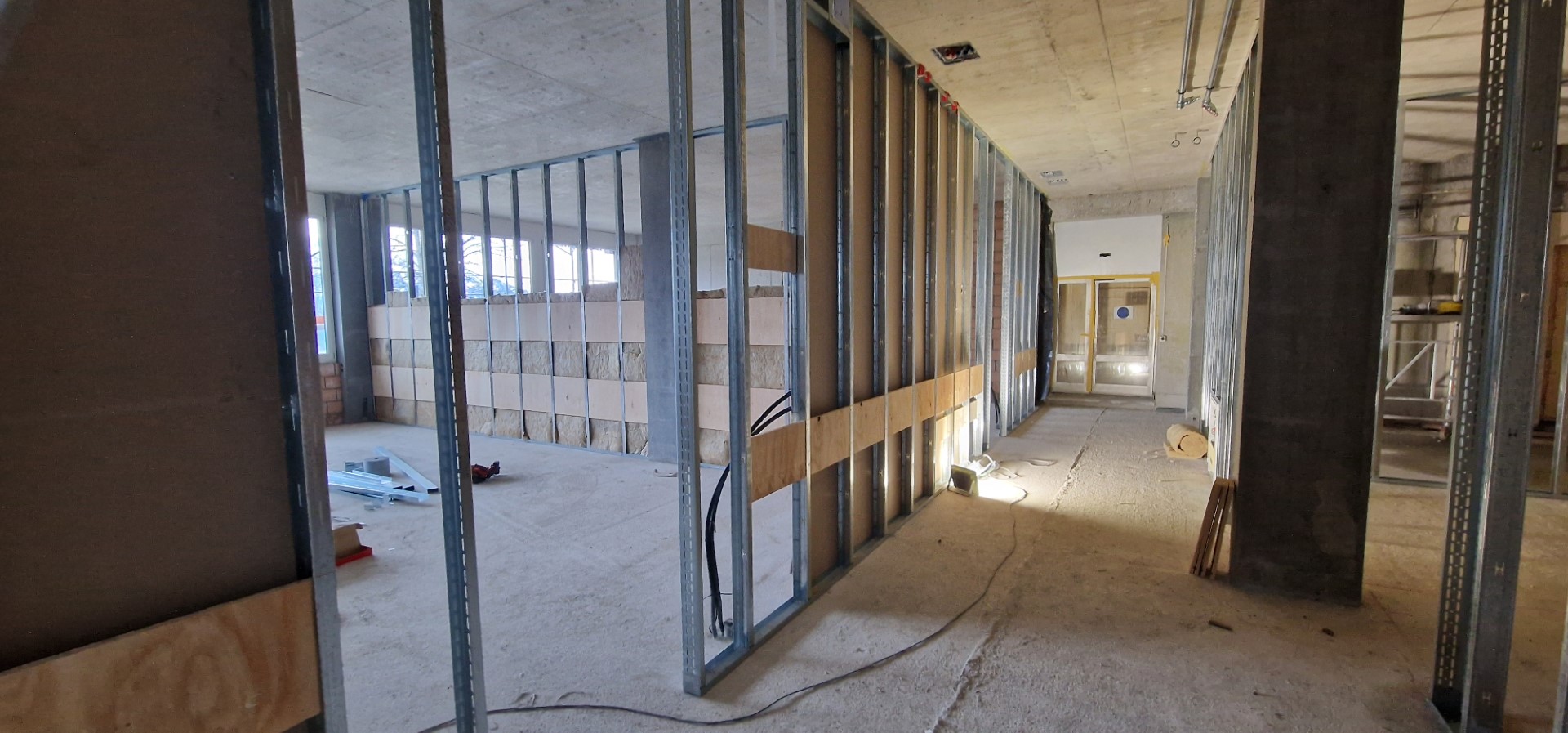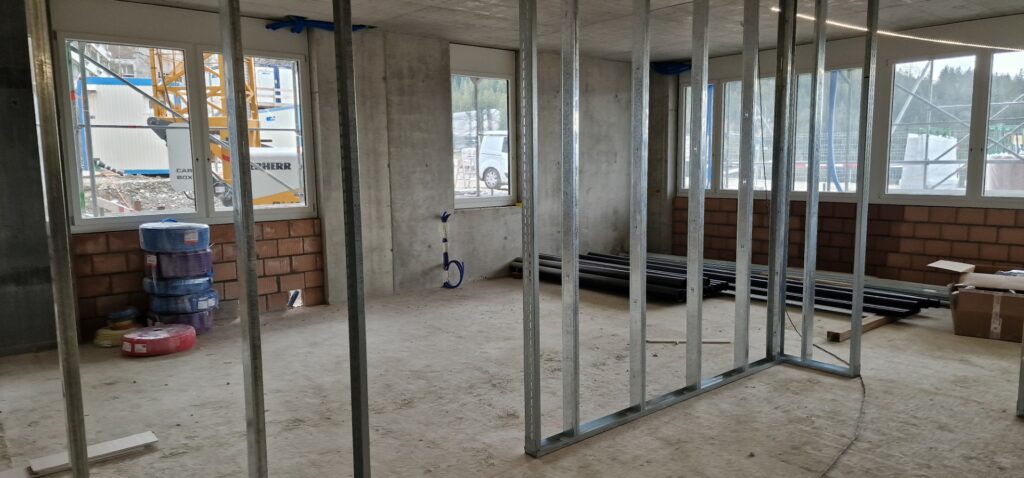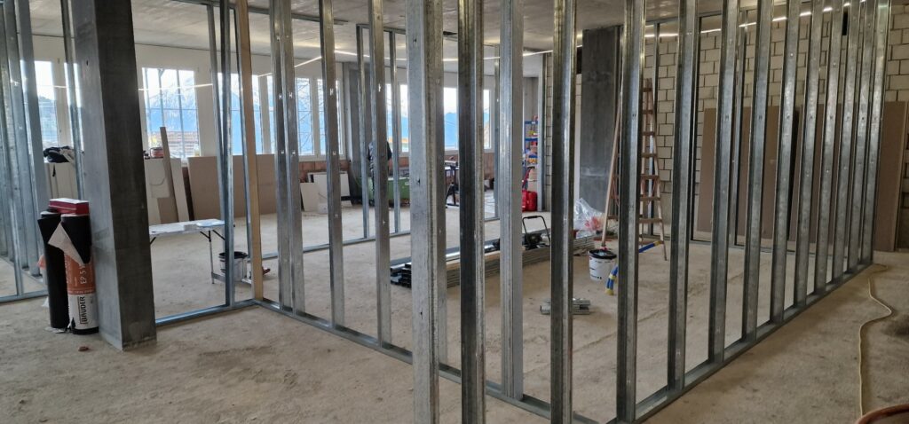 Dieser Eindruck währte aber tatsächlich nicht sehr lange. Waren es zuerst noch die Stützen, die den Raum füllten, machten sie kurz darauf bereits Platz für die Profile der Leichtbauwände: