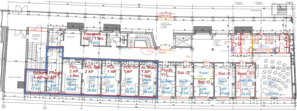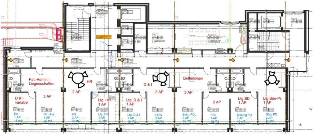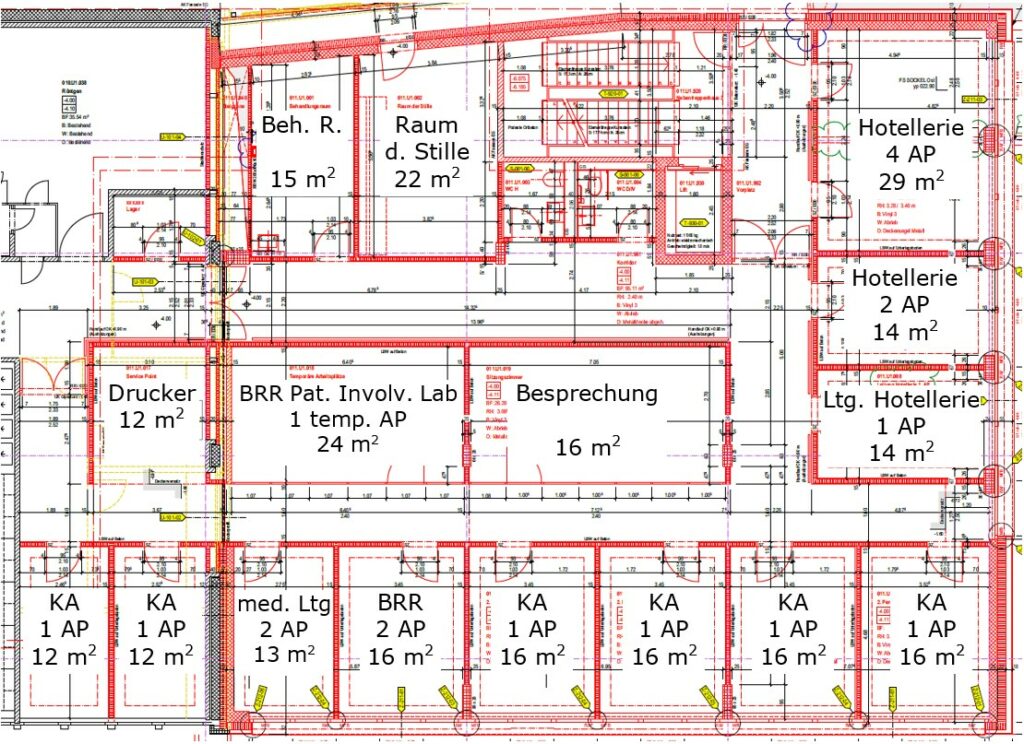 Als Folge der Bemühungen, zusammengehörige Teams auch büromässig zusammenzuführen, soweit das möglich ist, haben sich verschiedene Raumrochaden ergeben, welche über das Sockelgebäude hinausreichen. Folgende Vorgaben hinsichtlich dieser Bürowechsel waren nachstehende Punkte: