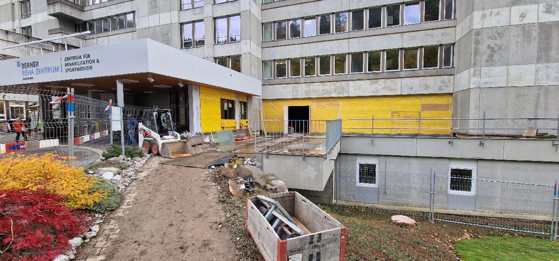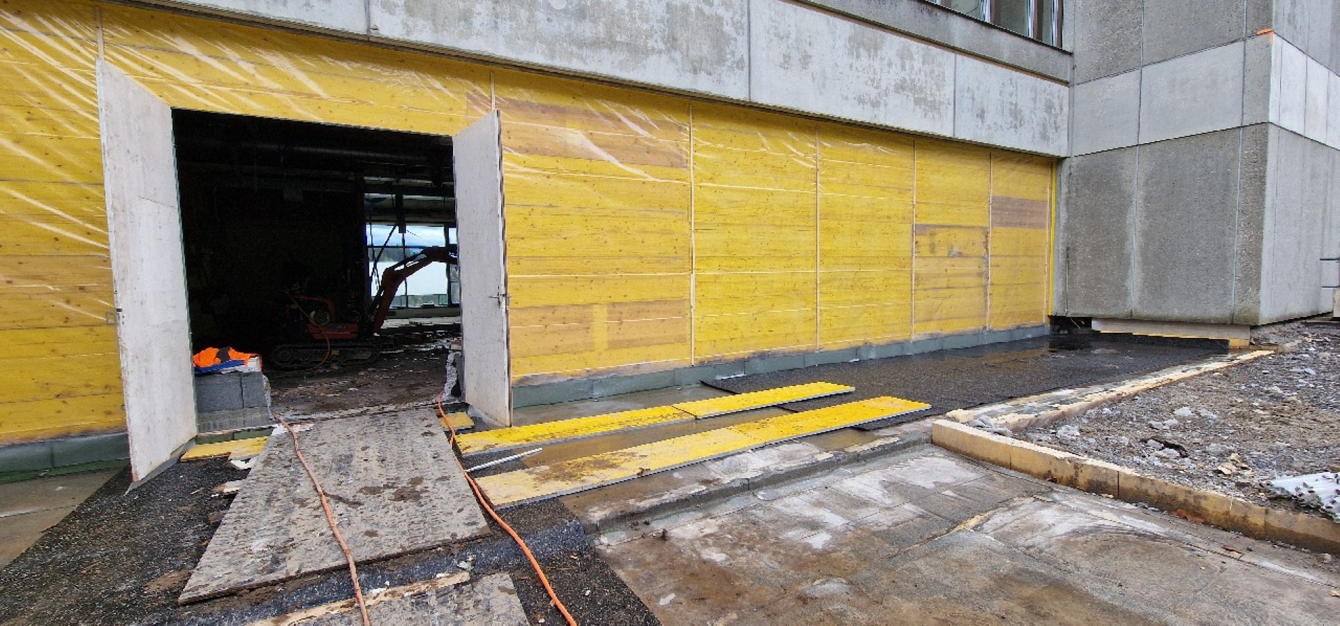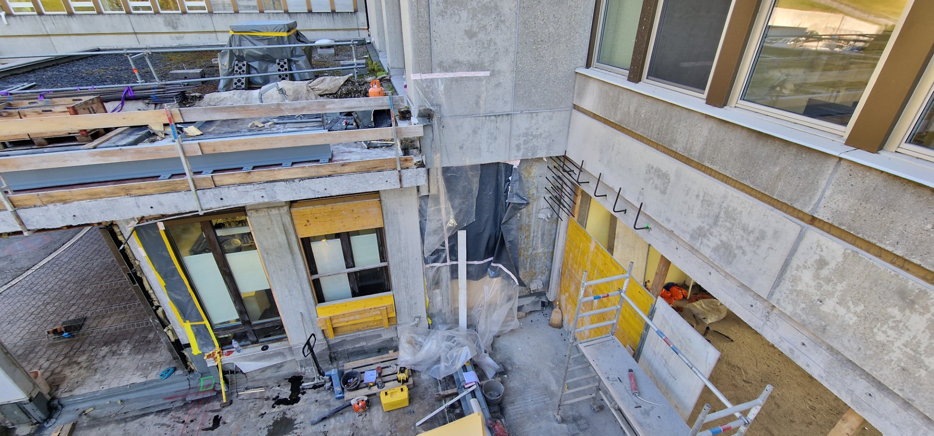 Auch auf der Aussenseite wurde fleissig auf- und abgebrochen. Zum einen soll die Nordfassade um rund 5 Meter vom Gebäude weg versetzt werden, um mehr Innenraum zu schaffen, zum anderen muss der neue, bislang nicht vorhandene Eingangsbereich mit einem an den Bestand anschliessenden Dach erschlossen werden…
