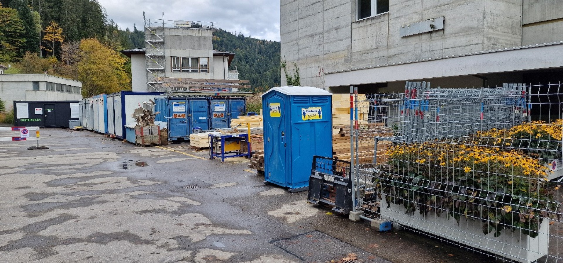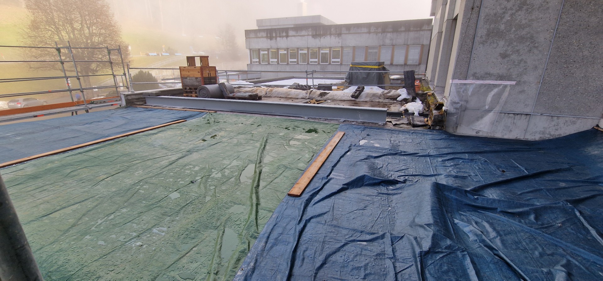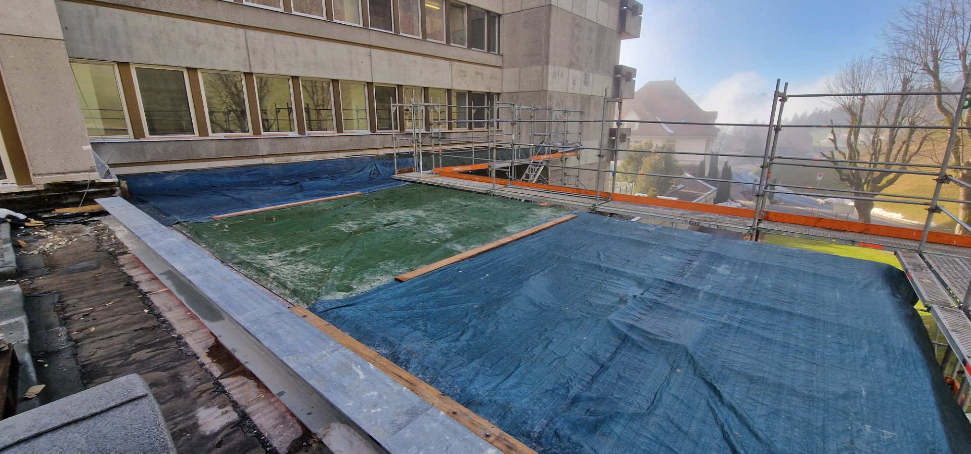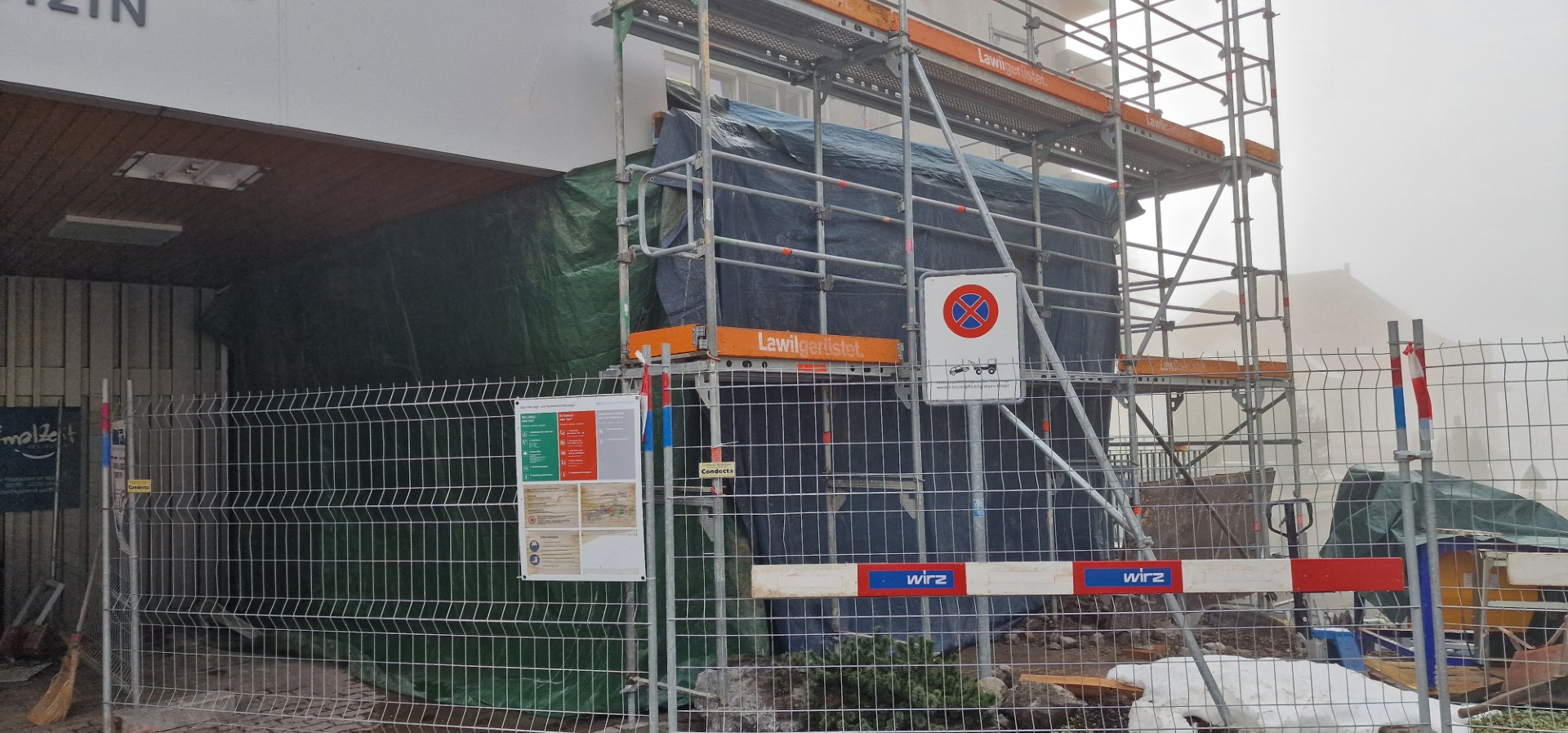Auch auf der Aussenseite wurde fleissig auf- und abgebrochen. Zum einen soll die Nordfassade um rund 5 Meter vom Gebäude weg versetzt werden, um mehr Innenraum zu schaffen, zum anderen muss der neue, bislang nicht vorhandene Eingangsbereich mit einem an den Bestand anschliessenden Dach erschlossen werden…