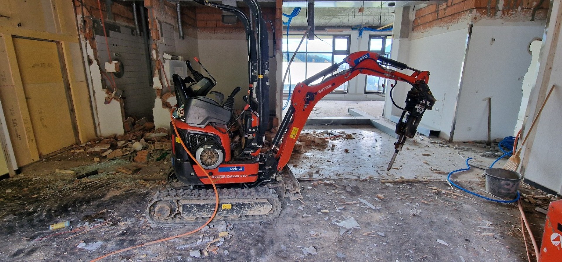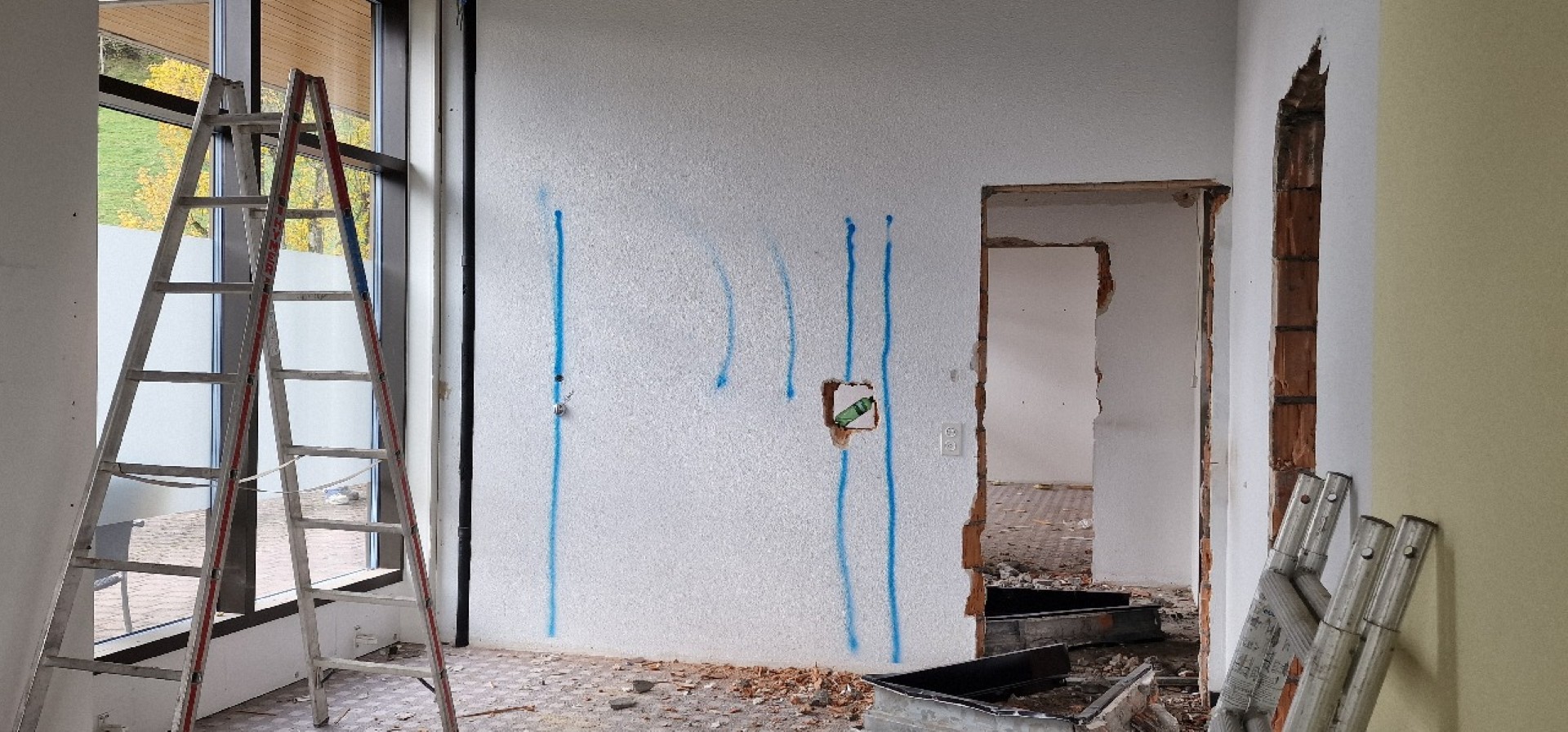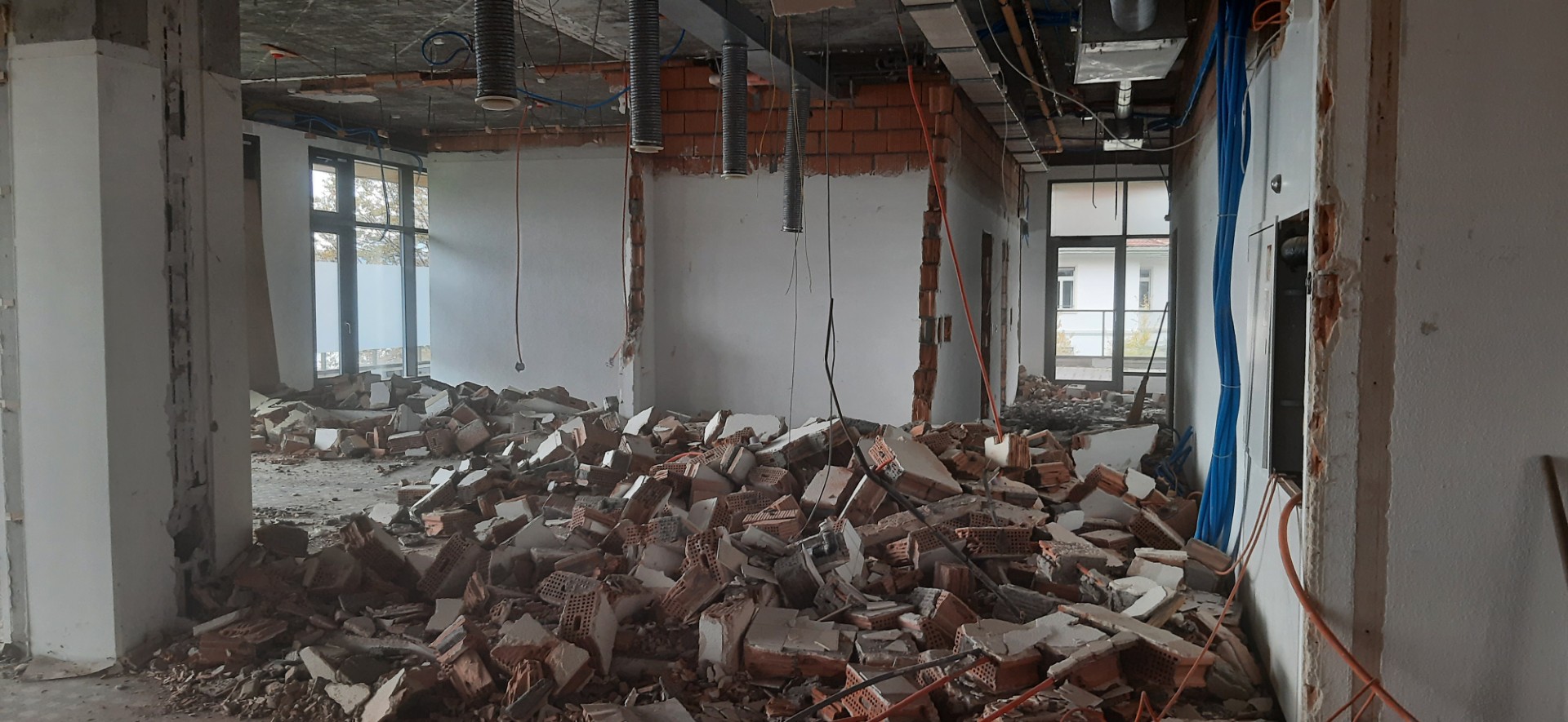 Mit dem Abschluss der Umzugsarbeiten im Erdgeschoss konnte mit dem Rückbau der alten Büroräumlichkeiten in diesem Bereich gestartet werden. Einmal mehr war es erstaunlich zu sehen, wie schnell der Innenausbau entfernt werden konnte…: