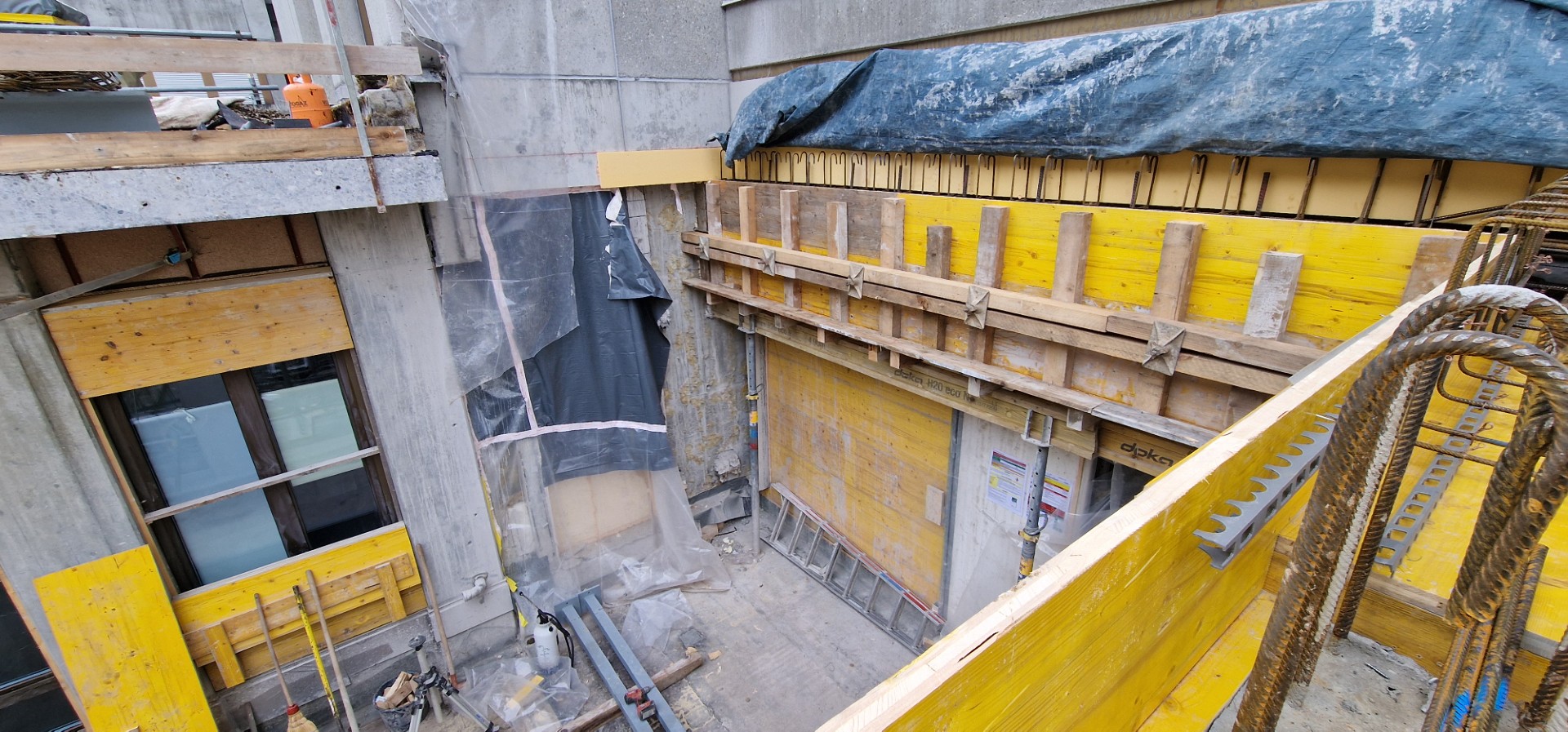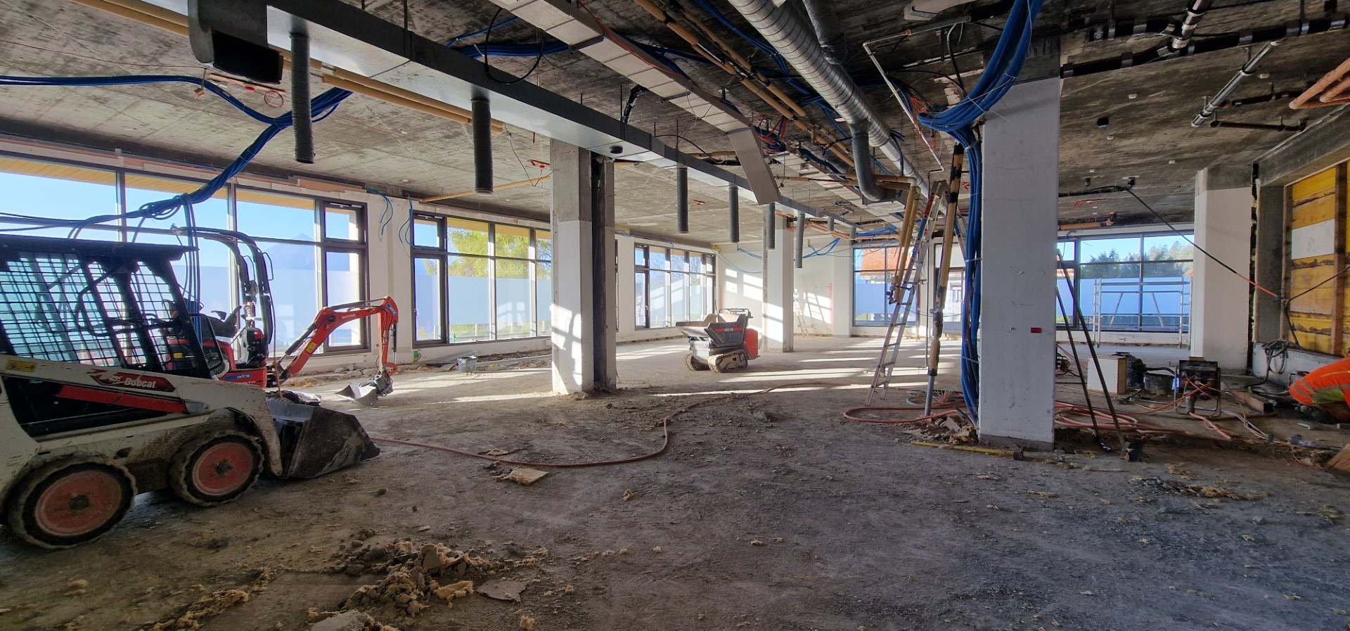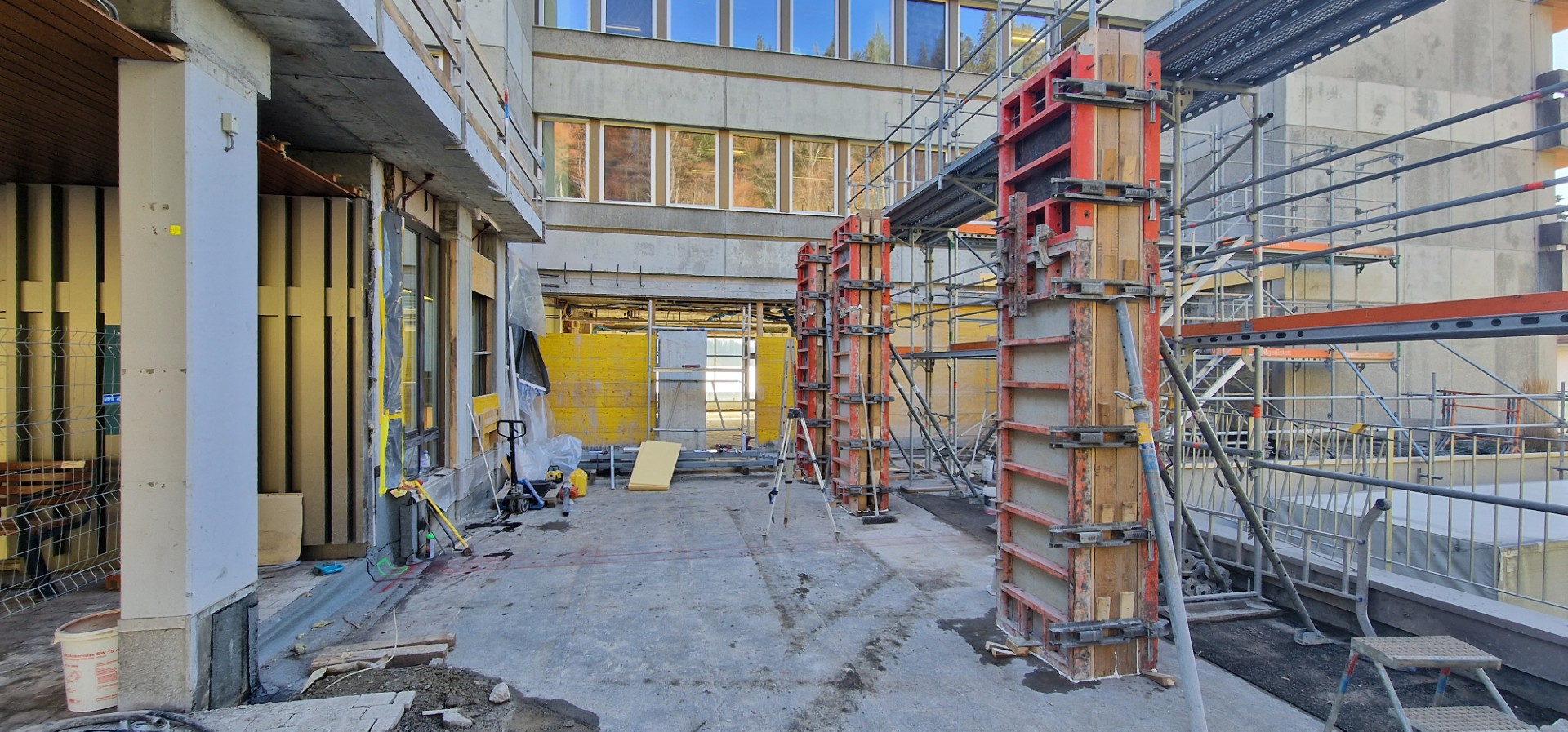 In den kommenden Wochen wird Aussen an der Fertigstellung des neuen (Haupt-)Eingangs weitergearbeitet, während im Innern der Ausbau im Bereich der Westseite des Gebäudes im Zentrum der Aktivitäten steht.