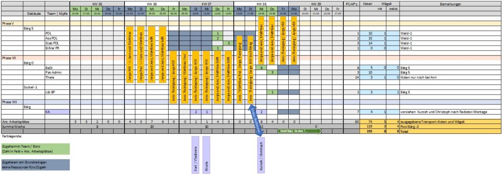 Um mit der Phase 2 im Bau-Projekt, dem Umbau des Erdgeschosses auf der Westseite sowie der Erstellung des neuen Eingangs starten zu können, mussten zuerst alle Büros in diesem Bereich, und das waren doch einige Arbeitsplätze, gezügelt werden. Nachstehend ein Eindruck der Planung hierzu: