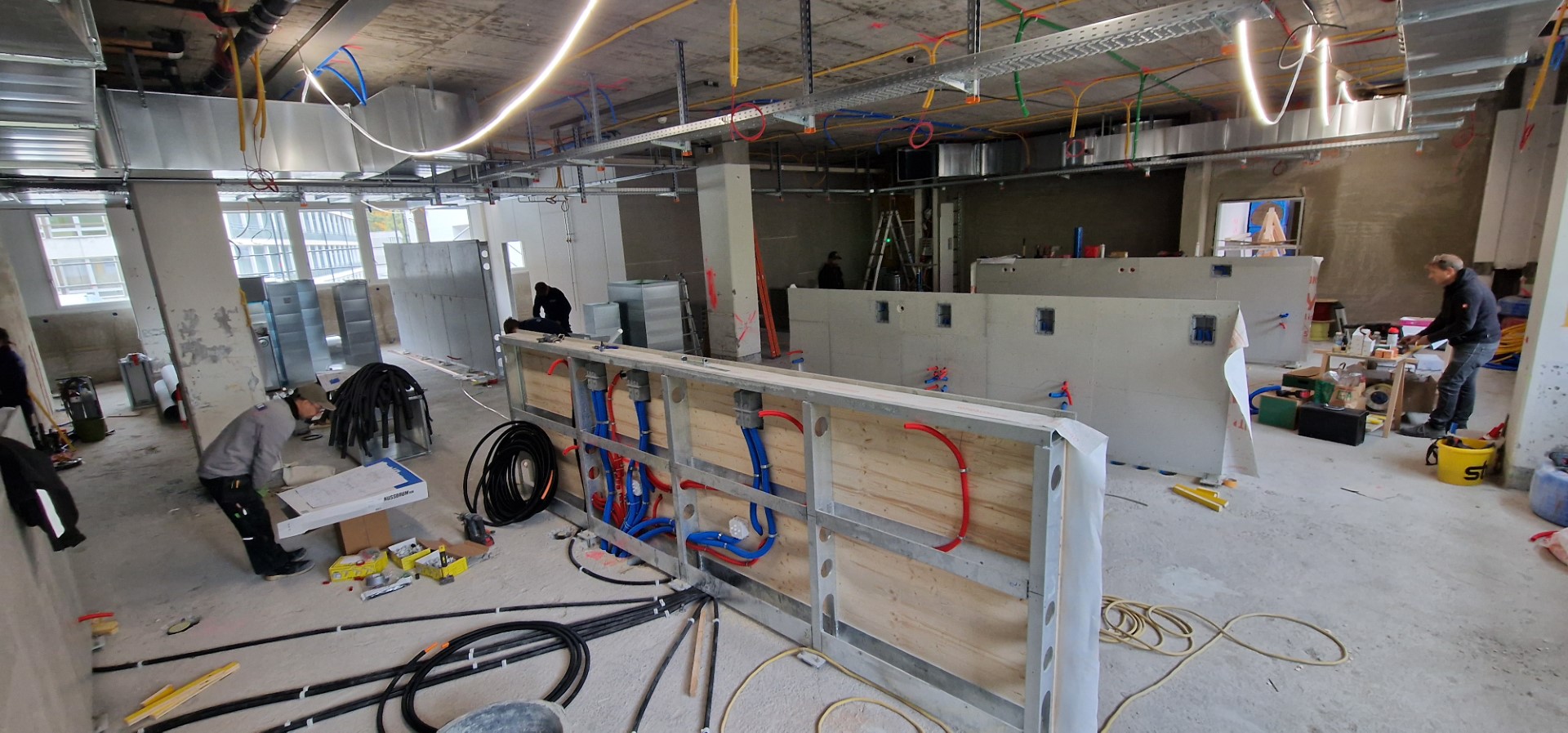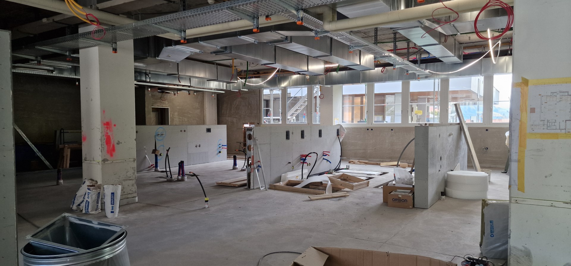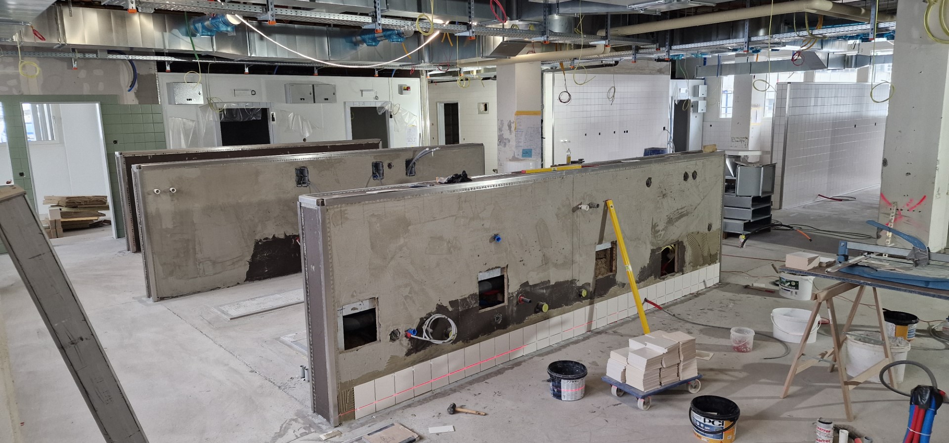 In den vergangenen Monaten wurde fleissig an verschiedenen Stellen am Bauprojekt gearbeitet. Für die Mitarbeitenden, Gäste und Besucher oftmals nur indirekt oder auf dem Weg durch die Klinikgebäude erfahrbar, standen in den Teiletappen der Phase 3 vor allem Innenausbauarbeiten im neuen Eingangsbereich und rund um den Betten- und die Personenlifte im Zentrum. Aber auch die mit dem Umbau der Küche zusammenhängenden Haustechnikinstallationen, insbesondere die Elektro- und Sanitärarbeiten, haben viel Zeit und Ressourcen in Anspruch genommen.