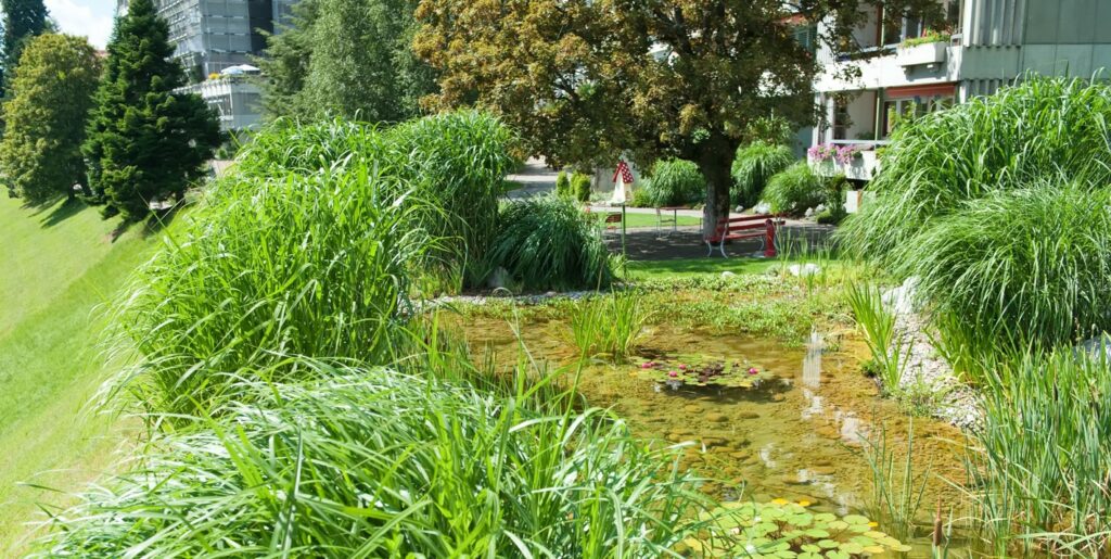 Nach der Prüfung zahlreicher Möglichkeiten wurde entschieden, im Personalhaus Ost 2 drei 2-Zimmer-Wohnungen zu 6 Gästezimmer umzubauen. Das Personalhaus Ost 2 befindet sich in direkter Nachbarschaft zu den Klinikgebäuden und ist umgeben von einer gepflegten und ausserordentlich ansprechenden Gartenlandschaft: